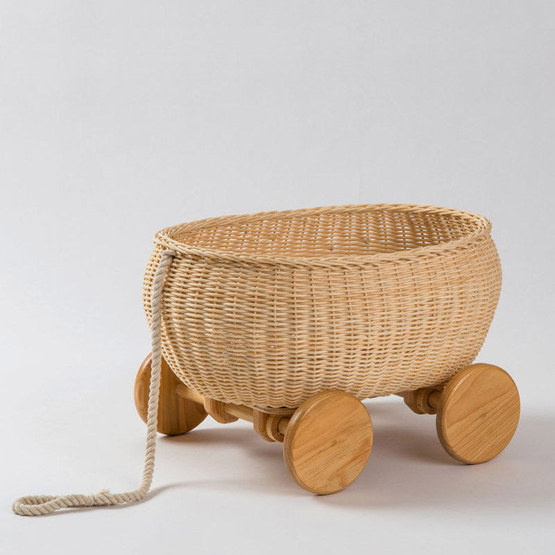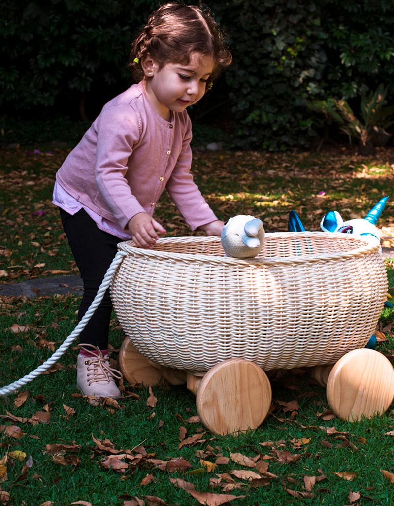 Juguetero, tejido en mimbre 100% natural con ruedas de madera y cordón de algodón. Perfecto para mantener ordenados los juguetes en cualquier espacio…